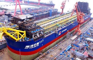 8日,我国迄今为止建造的吨位最大、造价最高、技术最新的30万吨海上浮式生产储油船“海洋石油117号”在上海外高桥造船有限公司顺利下水。据悉,该船造价高达2.4亿美元,船东是美国康菲石油公司,是我国出口美国的最大宗机电产品。