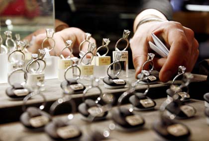 22日,在美国纽约第47大街西部的一家珠宝店,一名珠宝商整理待售的钻戒。纽约第47大街是传统钻石珠宝店汇集的地方。随着互联网在线钻石销售公司的迅速发展,这些传统珠宝店的经营受到强大的冲击。据报道,一家总部设在西雅图的在线钻石销售公司2006年的销售收入估计达到2.5亿美元,而6年前仅为4400万美元。