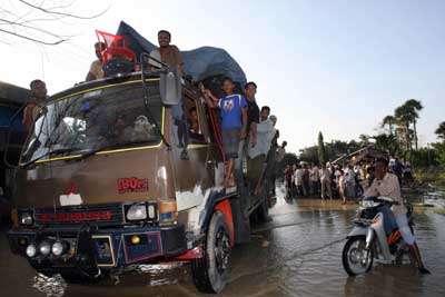 25日,在印度尼西亚亚齐的兰沙,当地居民搭乘汽车离开自己的家园。印度尼西亚亚齐特区官员当天说,当地已有19.8万居民因暴雨引发的洪灾而被迫转移。