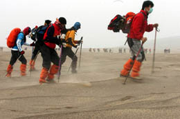 2月4日,一批户外运动爱好者穿越位于新疆的库木塔格沙漠。此次穿越挑战赛历时24小时,户外运动爱好者们昼夜不停地徒步行走了40多公里。