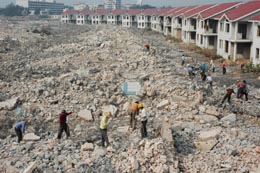 工人们正在一片废墟回收废弃的钢筋。这片位于国家旅游度假区北海银滩入口处的烂尾别墅群建于上个世纪九十年代初,成为那一轮“房地产热”的遗留泡沫。由于开发商违规抵押,造成产权不清、债务错综复杂,北海市最近将这最难啃的“烂尾楼”骨头成功拍卖,全部87幢别墅正在进行拆除,原址将按功能区规划建设旅游项目。