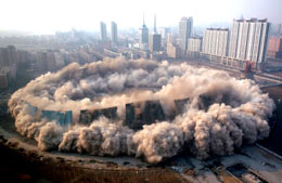 始建于1988年的五里河体育场是一个能容纳近六万人的体育场。2001年10月7日,中国足球队在这里战胜阿曼队后,提前获得2002年世界杯决赛阶段入场券,这是中国足球第一次进军世界杯决赛阶段。2006年初,沈阳市政府决定,异地修建一座全新的足球场承办奥运会比赛,将五里河体育场爆破拆除。图为2月12日,沈阳五里河体育场在下午3时整被成功爆破拆除。