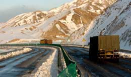 3月7日,两辆货车通过已经恢复通车的北京至拉萨高速公路乌海段。当日,受降雪天气影响封闭的北京至拉萨高速公路(110高速)内蒙古段全线恢复通车。