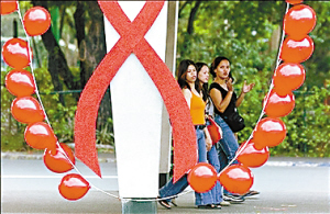 三名菲律宾妇女从象征艾滋病的红丝带旁经过。近年来菲律宾感染艾滋病病毒的人数不断上升。