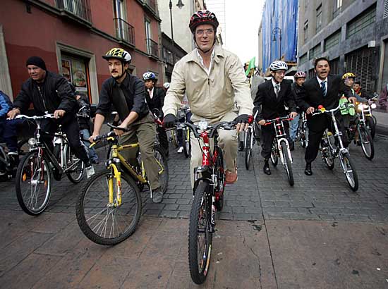 2日,为推广使用自行车,墨西哥首都墨西哥城市长马塞洛·埃夫拉德(中)带头骑自行车上班。墨西哥城近日兴起一场推广使用自行车运动。