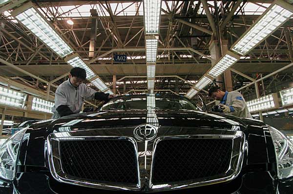 4月4日,华晨汽车集团中华轿车总装车间的两位工人在生产线上作业。为满足市场需求,华晨汽车集团全面提高产能,目前,中华轿车日产445辆,平均2分18秒生产一辆。据了解,2007年1月中华轿车销量突破10000辆。