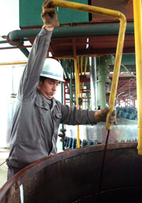 近日,江西新时代油脂工业有限公司创新工艺、自行设计生产的生物柴油生产线投产,预计年生产能力可达1.8万吨。这种创新工艺生产出的生物柴油可单独或混合石化柴油供车辆使用。这种新工艺为废油再利用提供了新出路。图为工作人员在生物柴油生产线上操作。