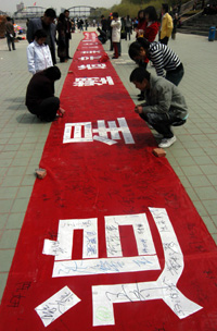 4月8日,一些年轻人在兰州市滨河路“健康追星、理智追星、塑造完美人生”签名活动的横幅上签名。