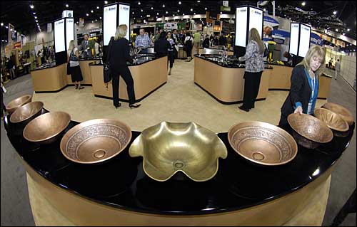 8日,在美国拉斯韦加斯会展中心举行的2007年国际厨房和卫生间产品展上,参展商展示各种金属洗脸盆。来自全球各地的厨房和卫生间产品生产厂商和设计商参加当天开幕的国际厨卫产品展,推出了最新的产品和设计。