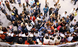 5月16日,众多应聘者在沈阳残疾人就业双向选择洽谈会上与用工单位人员洽谈。