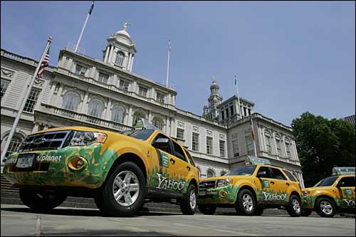 22日,由一家公司捐赠的3辆福特牌混合动力出租车停在美国纽约市政厅前。纽约市市长布隆伯格宣布,纽约所有出租车将在2012年前全部改用混合动力。出租车和轿车委员会也将在今后4年的时间里对出租车执行尾气排放和车辆行驶里程的新标准。