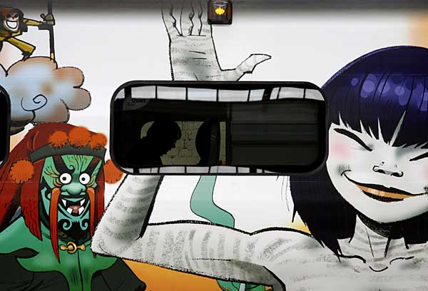 29日,在英国伦敦尤斯顿车站,一位乘客坐在车身外画满漫画的列车车厢内。近日,一位英国设计师以大幅漫画的形式为他的最新歌剧作品《猴子:西游记》在列车车厢外做宣传。