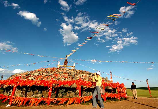 6月21日,在呼伦贝尔市金帐汗草原上,一名来自广东的游客在拍摄草原风光。随着盛夏的到来,内蒙古广袤的大草原上的蓝天、白云、绿草、牛羊汇成了美丽的自然风光,浓郁的民族风情和独特的草原文化,吸引着众多游客前来观光旅游。
