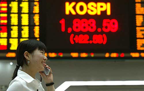 9日,一名女青年在韩国首尔一证券市场里打电话。当天,韩国首尔股市综合指数收于1883.59点,比前一个交易日上涨了22.58点,再创历史新高。