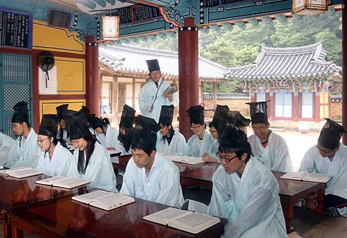 11日,身着传统服饰的韩国大学生在首都首尔以南300多公里的一处传统书院内学习儒家文化。时值韩国暑期,许多学生来到这家书院学习传统文化。