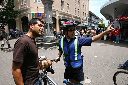16日,一名骑自行车的哥斯达黎加警察在首都圣何塞市中心的步行街上接受市民咨询。哥斯达黎加是世界上少数没有军队的国家之一,其警察部队有数万人,担负着国家的社会治安和边境安全等任务。