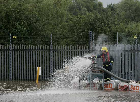 7月23日,在英国格洛斯特城的威尔翰发电站,救灾人员用水泵抽水。由于近日连降大雨,英国两大河流之一的塞文河水位远超往年正常水平。23日,塞文河洪峰经过格洛斯特城,而为切尔滕纳姆市与格洛斯特郡提供电力的威尔翰发电站面临被洪水淹没的威胁。为此英国有关部门已紧急投入救援工作。