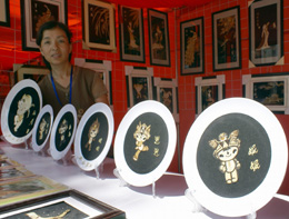 在日前开幕的第八届哈尔滨民间民俗艺术博览会上,展出了许多民间艺人创作的奥运主题工艺品,这些栩栩如生的奥运工艺品吸引了众多参观者。图为一位民间艺人展示芦苇贴画奥运福娃作品。