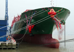 这艘名为“新亚洲”号的超大型集装箱船船体总长335米,设置九个货舱,总装箱量达8530标准箱,载重量10.1万吨,航速25节。它是目前中国自主设计建造完成的最大型集装箱船。