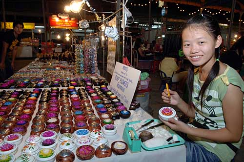 9月15日,一位小姑娘在泰国清迈长康路夜市上制作烛花和皂花。清迈是泰国第二大城市,也是泰国北部政治、经济和文化中心,这里曾长期作为泰国纳兰王朝的首都。清迈人秉承了世代相传的手工艺技巧,使清迈成为全球最大的手工艺品制造中心之一。每当夜幕降临,各种手工艺品汇集的清迈长康路成为最让游客心仪神往的繁华夜市。