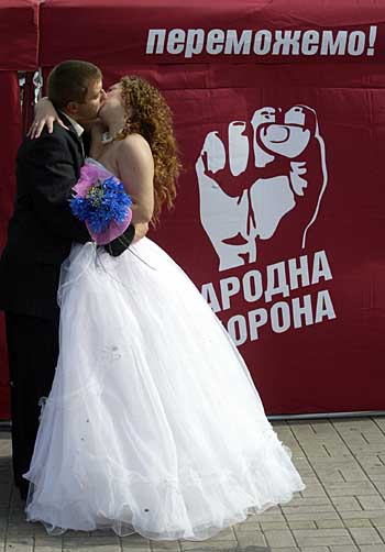 25日,在乌克兰的顿涅茨克,一对新婚夫妇在一个政党为竞选宣传搭起的帐篷前相拥而吻。乌克兰将于9月30日举行议会选举。