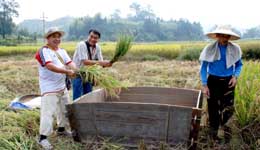 10月6日,两位香港游客在婺源乡间的稻田里体验收割稻谷农事活动。“十一”黄金周,江西婺源优美的田园风光和淳朴民风民俗引来众多中外游客,绿色环保的乡村游深受游客青睐。