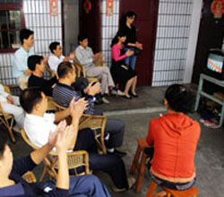 洪田村村民在收看十七大开幕盛况(10月15日摄)。