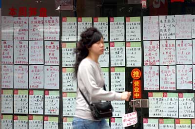 11月1日,一位女士从广州一家房地产中介公司橱窗前走过。广州市政府规定从当日起,广州无论一手还是二手房地产出售时都要将出售房屋基本信息和包括代收代管费在内的所有收费项目、标准和依据全部在经营场所醒目位置采用价目表牌等形式公开标示,并且房屋售价必须提前24小时公示。