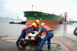 全国最大商用石油和保税油品仓储企业中化兴中石油转运(舟山)有限公司所属岙山基地,2007年年吞吐各类油品达1539.41万吨。图为一艘30万吨级油轮“阿波罗荣耀”号装载11万吨燃料油靠泊在岙山基地。