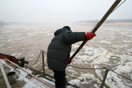 1月14日,河务人员在黄河济南泺口段观测流凌。