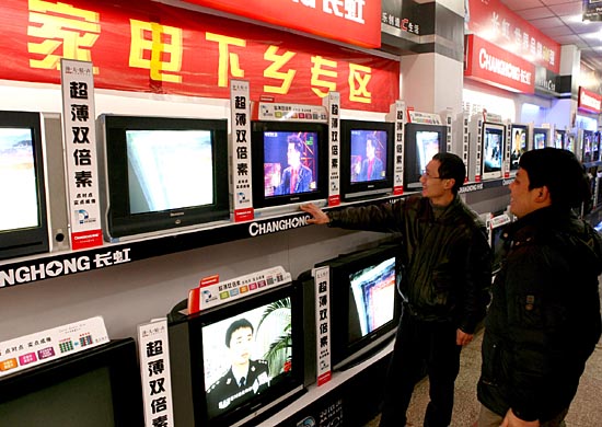 1月15日,四川省华蓥市双河办事处昭勋村的农民在“家电下乡”网点选购彩电。近日,四川省启动“家电下乡”试点工作。农民购买补贴范围内的彩电、冰箱、手机类产品,凭有效证件可到当地的乡镇财政所申领“家电下乡”补贴,标准为家电产品销售价格的13%。