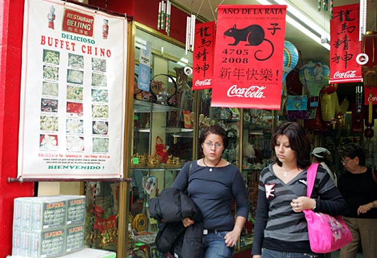 29日,在墨西哥首都墨西哥城的唐人街,两名女孩从一家售卖中国年货的店铺内走出。中国春节临近,位于墨西哥城的唐人街一派喜庆气氛。这里的年货市场开始红火起来,售卖的大都是中国商品,象征吉祥的“中国结”、中国“喜鼠”等受到许多当地人的喜爱。