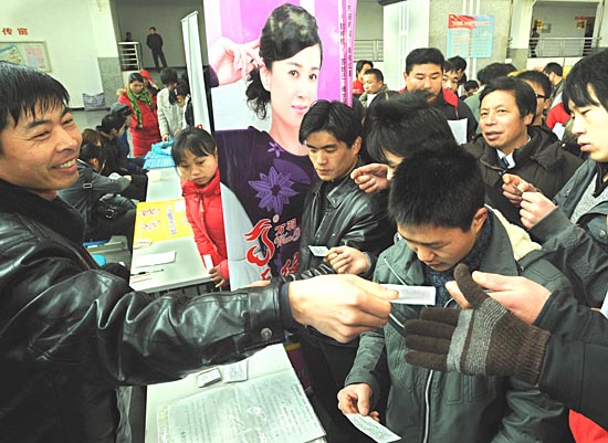 2月12日,一家义乌针织企业的招工者(左一)在向应聘民工们分发介绍企业的名片。