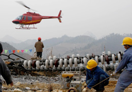 2月17日,一架直升机在广东省乐昌市云岩镇对遭受冰雪灾害的±500千伏江城输电线路的灾后重建情况进行巡查。江城输电线路的铁塔多位于深山老林中,那里的积雪覆冰尚未融化,人工巡查的难度很大。连日来,国家电网公司启用直升机对江城输电线路所处的高山区域进行巡查,并用机载设备进行拍摄,及时发现故障和隐患,为全面恢复供电提供资料。