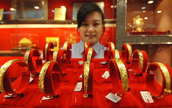 3月11日,沈阳某商场的工作人员在整理黄金饰品。从3月10日起,沈阳黄金足金价格达到260元/克,每克上调7元;千足金达到270元/克,每克上调7元,这是2008年沈阳黄金价格第3次上调。