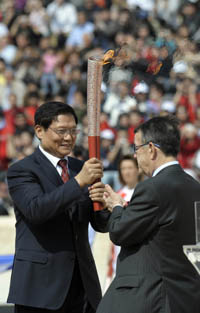 3月30日,中共中央政治局委员、北京市委书记、北京奥组委主席刘淇(左)在雅典1896年首届现代奥运会主会场从希腊奥委会主席基里亚库手中接过北京奥运会圣火火炬。当日,北京奥运会圣火交接仪式在雅典1896年首届现代奥运会会场举行。