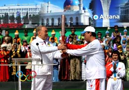 4月2日,中国驻哈萨克斯坦大使张喜云(右)在起跑仪式上将火炬交给哈萨克斯坦总统纳扎尔巴耶夫。阿拉木图市是北京奥运火炬接力“和谐之旅”的第一站。哈萨克斯坦总统纳扎尔巴耶夫出席起跑仪式,并作为第一棒火炬手参加接力。