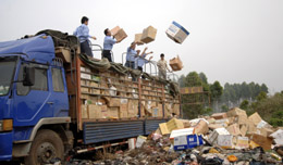 3月28日,海口广安大药房的工作人员在搬运过期药品。当日,在海口市药监局的监督下,由广州白云山和黄中药有限公司回收的4.5吨,价值近百万元的过期药品被付之一炬,此举可有效避免不法商贩将过期药品销往偏远农村。