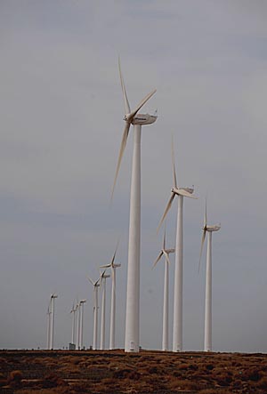 随着酒泉市1000万千瓦级风电基地建设项目日前获国家发改委批准并立项建设,甘肃省在河西走廊打造“风电走廊”的设想正在一步步变成现实。专家分析,甘肃省有望在今后10年内成为全国最大的风能产业带。图为甘肃省酒泉市号称“世界风库”的瓜州县县城附近的一处风电基地。