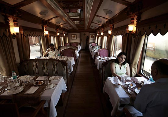 旅客在印度哈桑站停车的“金色战车”号豪华列车的餐车里吃饭(摄于4月10日)。“金色战车”号是卡纳塔克邦旅游发展公司为了促进旅游业和铁路部门联合开发的高档豪华列车。为了吸引商业旅行的客户,“金色战车”号上配有会议室和无线网络服务。新华社/法新