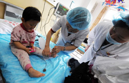 5月7日,两位医生在阜阳市人民医院为一名住院患儿检查身体。记者5月7日从安徽省卫生厅了解到,到5月5日24时,阜阳肠道病毒感染病例新增433例,病例总数已达4929例,死亡人数连续5天未上升。到5月5日24时,安徽全省17个市均有散在病例报告,全省共报告6545例。至今安徽全省已经治愈3166例,其中危重患者104例。