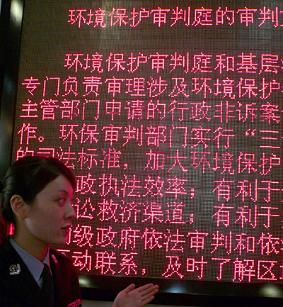 无锡市中级人民法院一名法警在介绍环保法庭的有关情况。新华社记者 王骏勇 摄