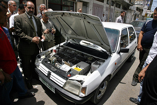 21日,在燃料紧缺的加沙地带,人们围观一辆由法耶兹·安曼(前左)等当地电气工程师共同设计的电动车。这辆车充电一次可以行驶200公里。