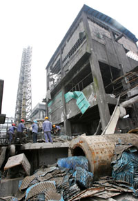 积极自救,恢复生产。5月24日,在四川什邡市蓥华镇蓥峰实业有限公司内,工人们在清理毁坏的厂房。新华社发(戚振林