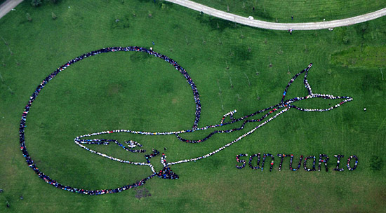 22日,人们在智利首都圣地亚哥的一片草坪上组成鲸鱼的形状和西班牙语“保护区”一词的字样。国际捕鲸委员会将于6月23日至27日在智利召开会议,再次就是否维持商业捕鲸禁令问题进行讨论。新华社/法新