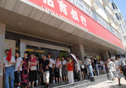 7月8日,合肥市民排队等待兑换奥运会纪念钞。