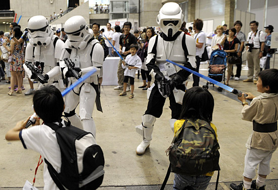 21日,在日本幕张举行的“《星球大战》日本庆典”活动上,几名儿童与《星球大战》中的角色克隆人“对战”。新华社/法新