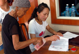 7月22日,四川省什邡市师古镇双安村87岁的高克群老人(左)领到2000元自建过渡房补助资金。汶川大地震后,重灾区四川省什邡市许多农村受灾群众自建起了过渡房。近日,按照相关政策,当地农村受灾群众开始领取自建房补助资金。