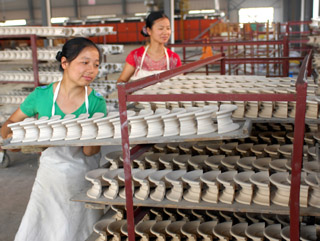 江西萍乡加快改造升级传统产业。图为江西省萍乡市黄冠化工填料有限公司的职工在搬运瓷环。新华社记者:周科