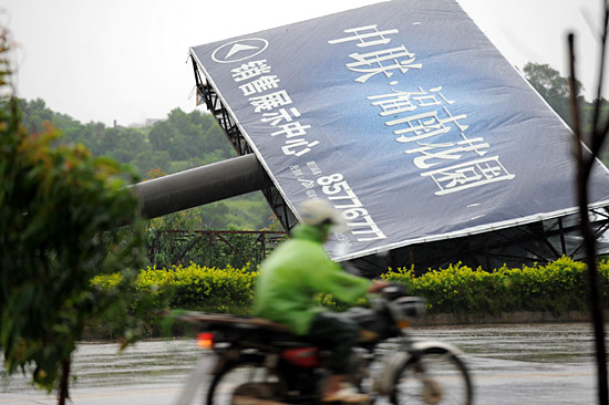 7月29日,福建省福清市一个巨型广告牌被吹倒。国家防汛抗旱总指挥部29日统计显示,受强台风“凤凰”带来的强降雨影响,福建、浙江两省目前已有33个县357个乡镇153.55万人受灾,倒塌房屋261间,农田受灾47.14千公顷,直接经济损失9.23亿元。